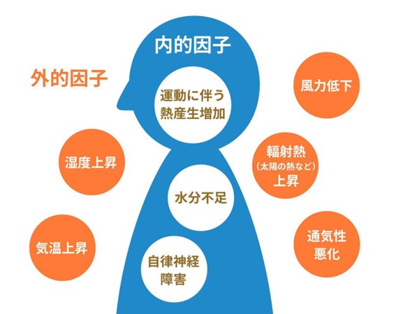 熱中症は、炎天下でのみ発症するとは限りません。気温や湿度の上昇といった体の外側で起こる要素(外的因子)と、運動による体温の上昇といった体の内側で起こる要素(内的因子)の2つが体に影響を与えることで、体温が上昇し、熱中症を引き起こしてしまうのです。
